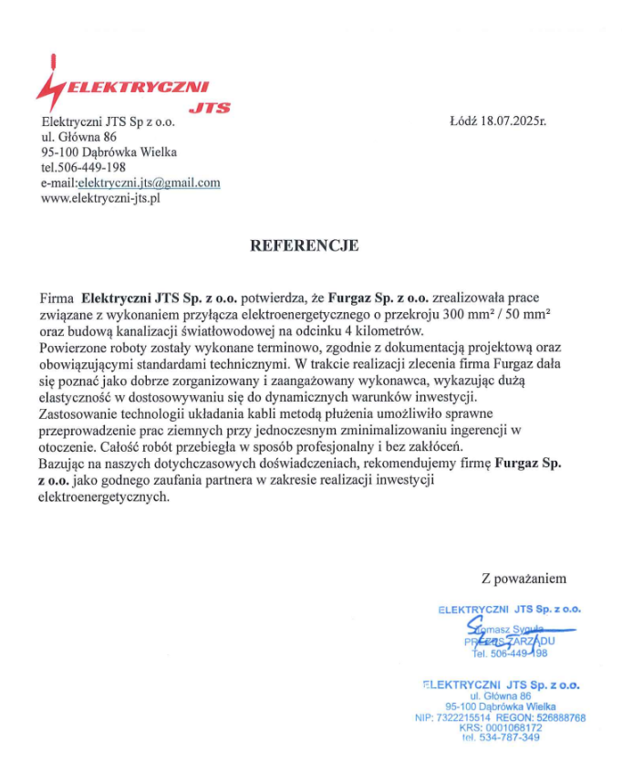 Realizacja Przyłącza 300 mm2 + 4 km światłowodu.
