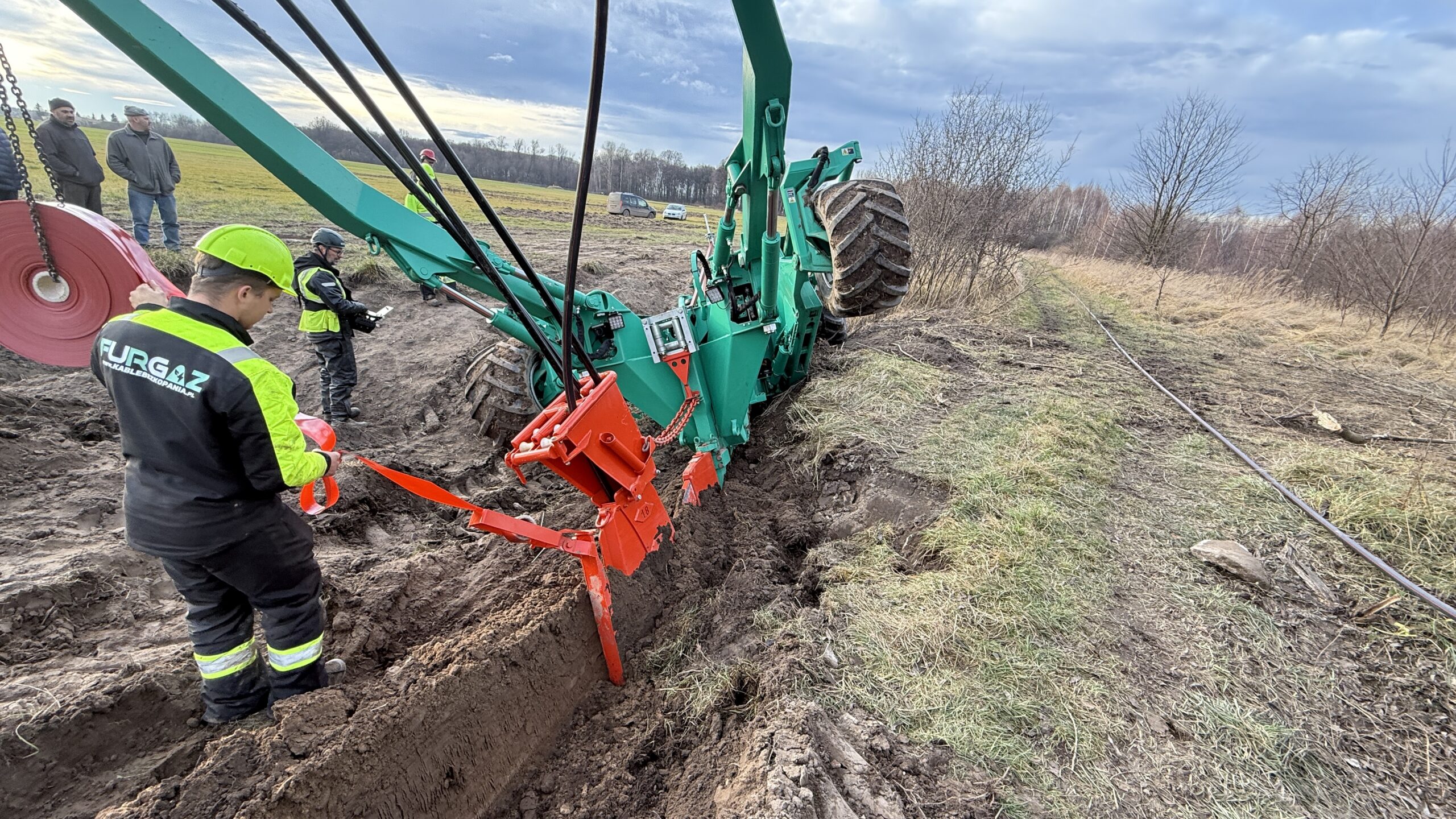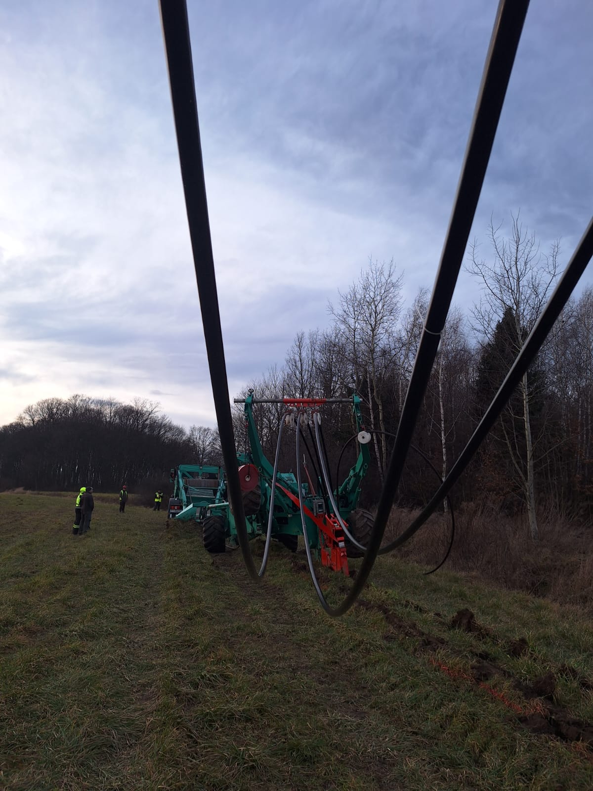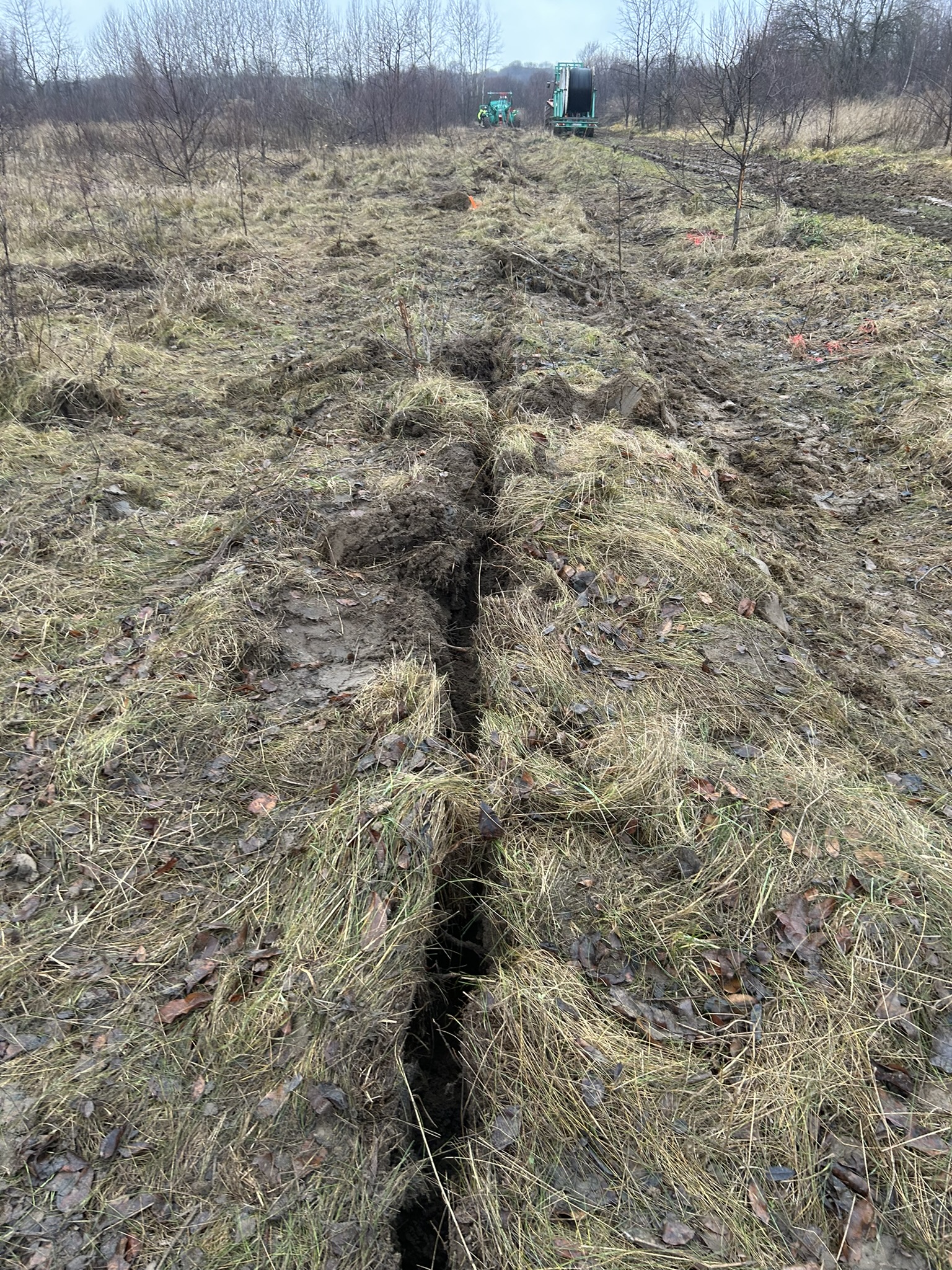Wykorzystanie technologii płużenia na odcinku 1 446 m, w tym sprawne i bezwykopowe pokonanie dużego rowu melioracyjnego bez przerywania struktury terenu.