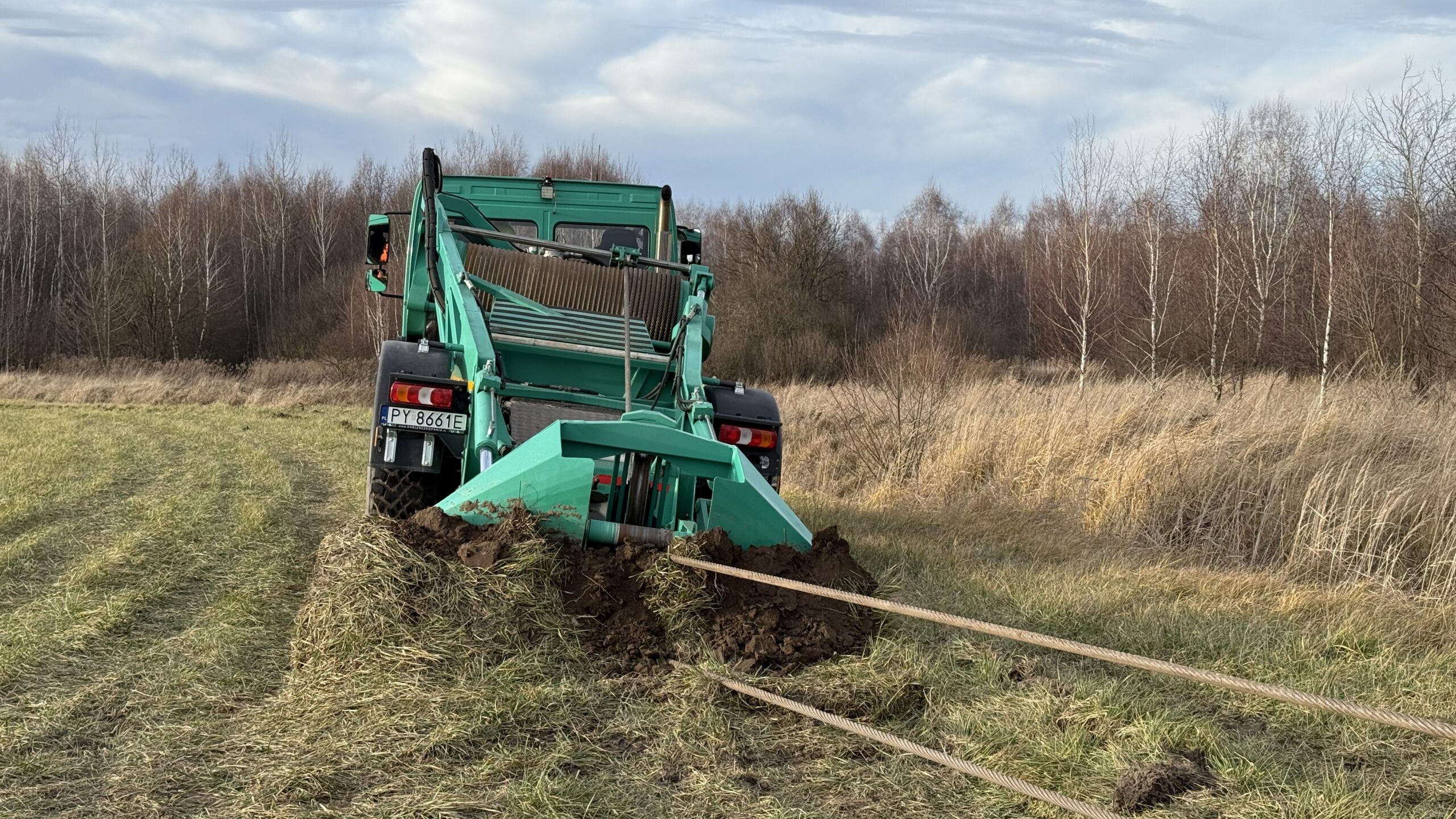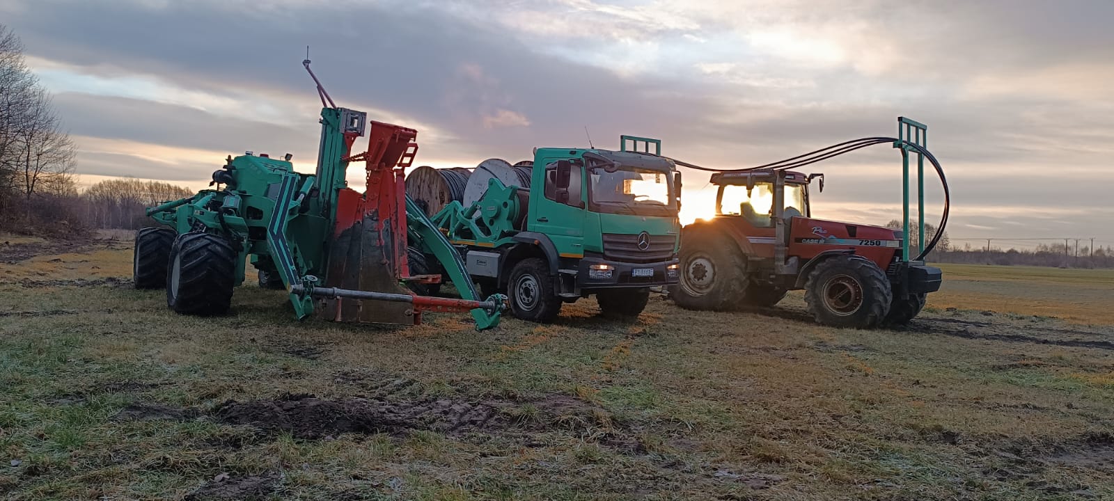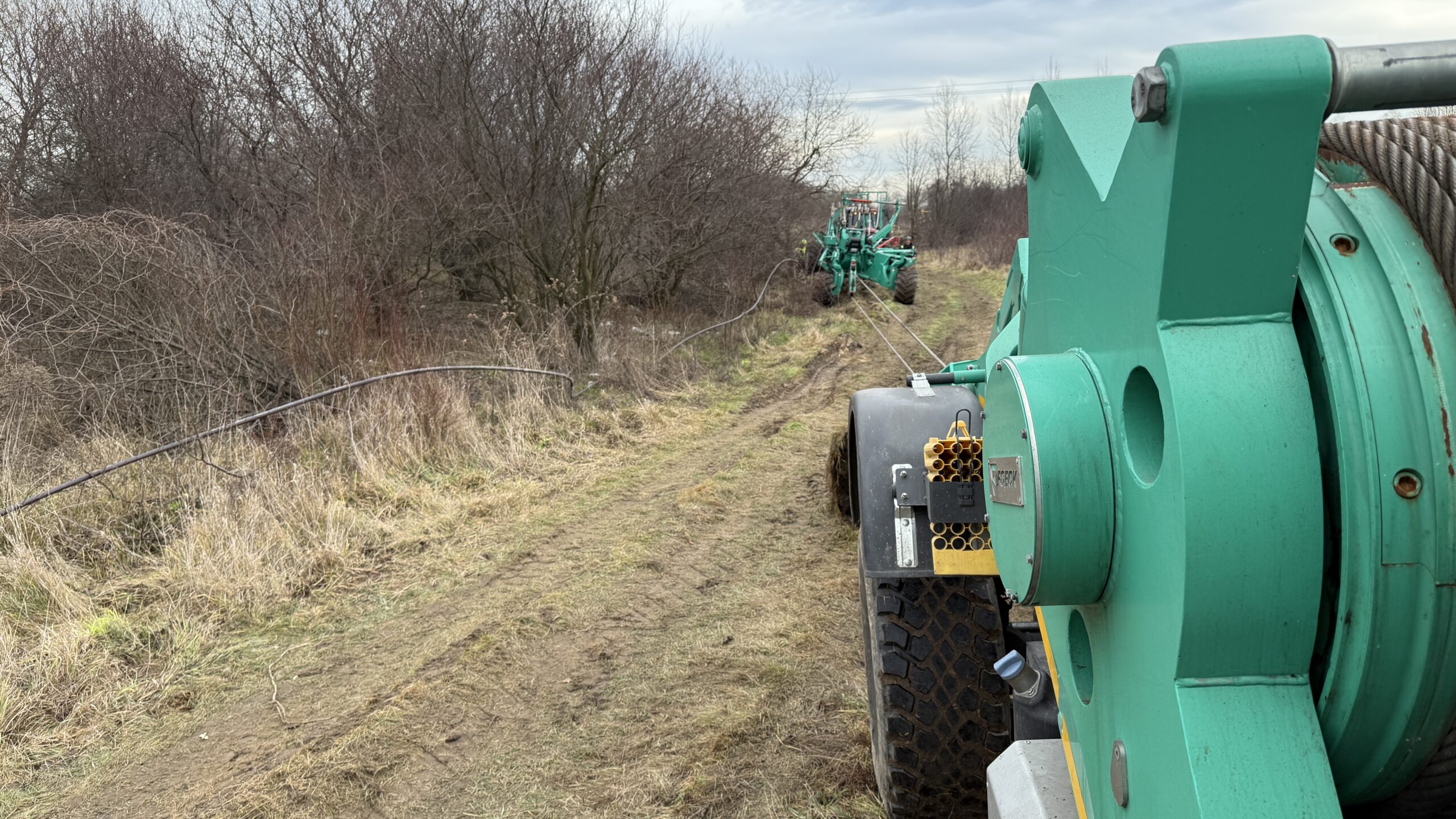 Wykorzystanie technologii płużenia na odcinku 1 446 m, w tym sprawne i bezwykopowe pokonanie dużego rowu melioracyjnego bez przerywania struktury terenu.